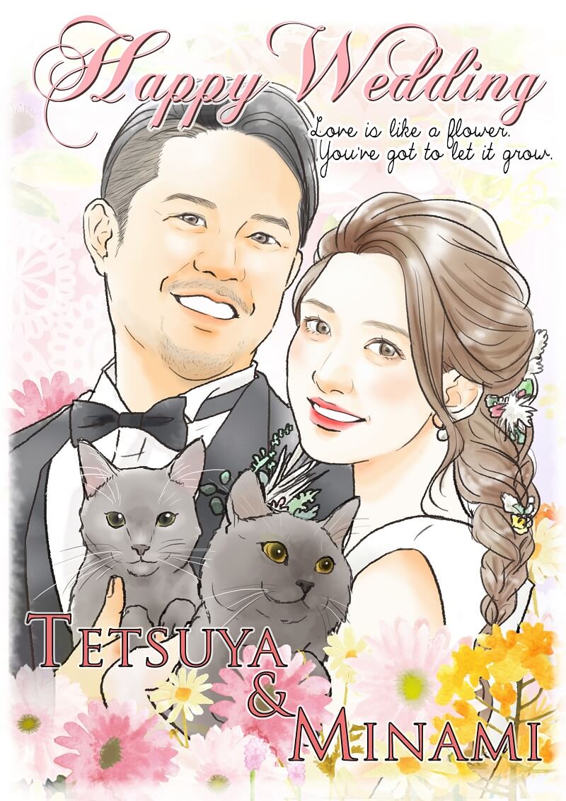 お顔は特徴を捉えつつリアル過ぎないタッチに、そして背景も丁寧に描かせて頂きます。